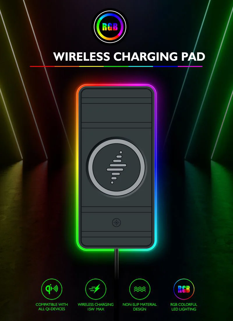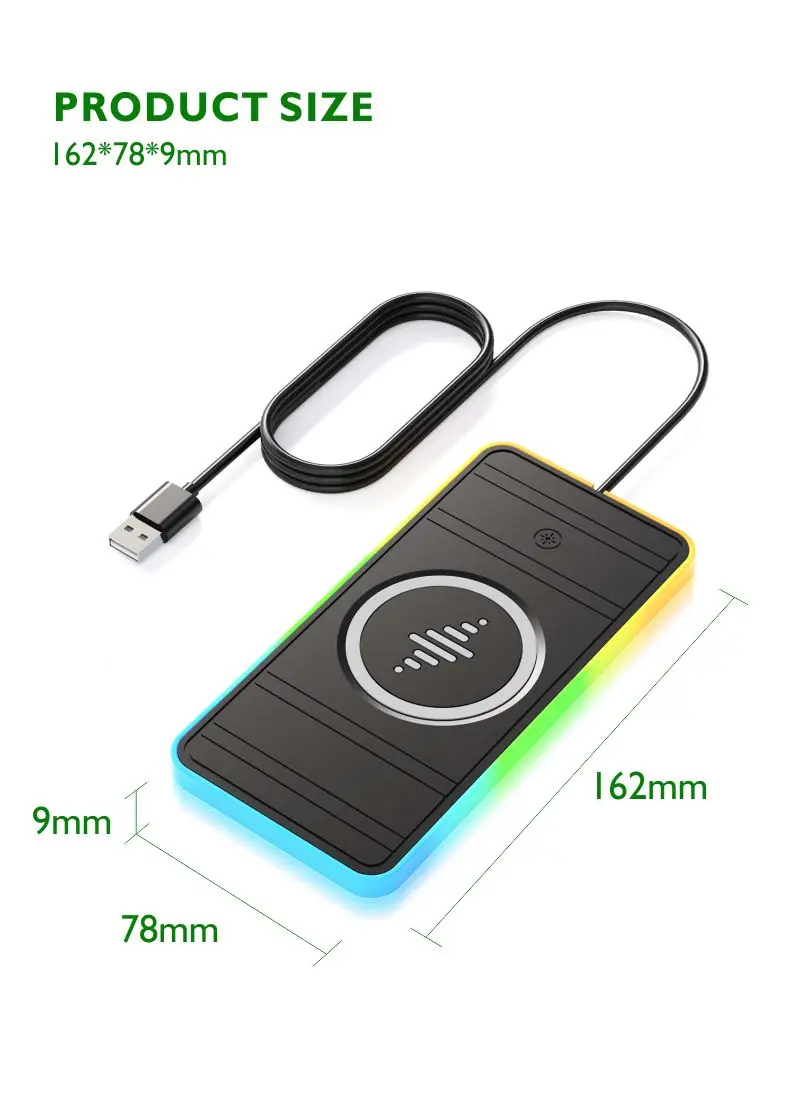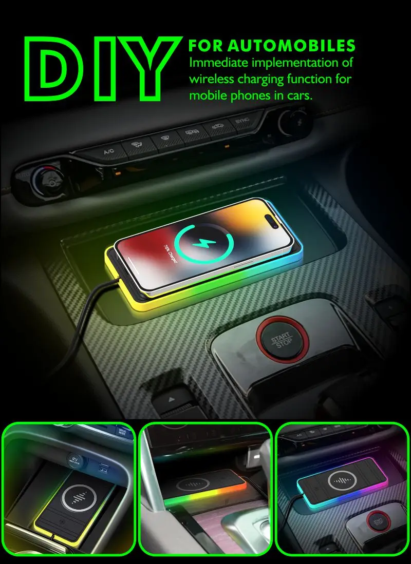 This car wireless charging pad is mainly to make full use of the car’s storage space, in addition to charging mobile phones, in order to maximize the use of wireless chargers, we also added Three functions. First, it can charge TWS earphones with wireless charging function; secondly, in order to give the car more sense of technology, RGB 7-color gradient breathing lights are added, Third, one hand touch to control the RGB Light.