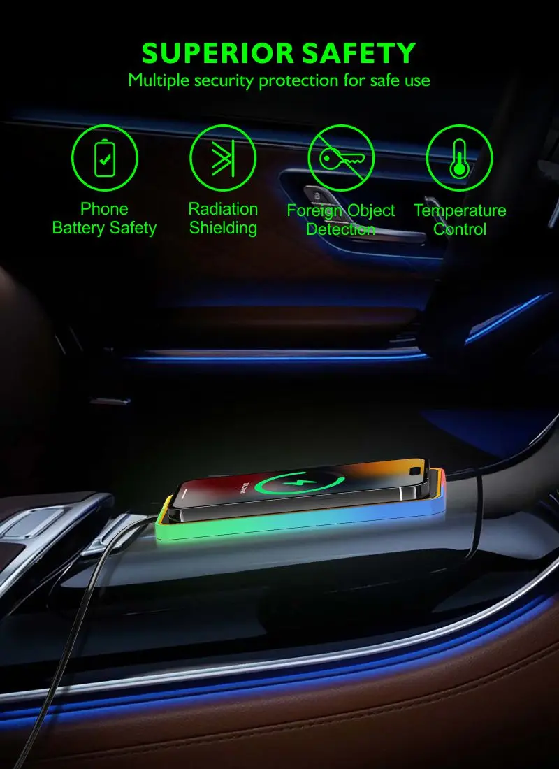 —The wireless charging pad is made with multi-functional smart protection technology, which provides a safe charging environment with overvoltage protection, temperature control, overcurrent protection and short circuit protection; IPX5 waterproof material,Rest assured on your driving journey.