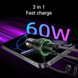 Multi-Device Fast Charging: ACEFAST 60W car charger equipped with 30W Type-C cable FAST Charging For iPhone 16/15 series/ For Samsung S24/S23/S22 series, PD30W, QC3.0 18W, support PD3.0/QC3.0/AFC and FCP super fast charging protocol. It can charge three devices simultaneously.