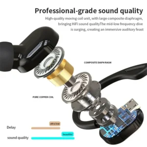 HD surround sound quality: professional sound quality, 8mm high-quality moving coil unit, with large composite diaphragm moving coil, brings lossless HF sound quality; The mid-low frequency dive is surging, and the high frequency is bright and transparent, creating an aural feast with its own version. Compound diaphragm woofer, full and vigorous bass; Metal diaphragm.