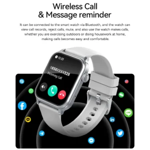 Bluetooth call, one-touch link call, contact, recent call record, Bluetooth music control,Health: real-time heart rate (tested every 10 minutes), blood pressure, blood oxygen, sleep, stress, female health, daily exercise, breathing training,Reminder: information reminder, call reminder, low battery reminder, alarm clock reminder, sedentary reminder, heart rate warning, target reminder,Practical functions: flashlight, mute, do not disturb mode, raise wrist and light screen, find mobile phone, weather, stopwatch, timer, alarm clock, voice assistant, small game, remote control camera, calculator, password lock,Multiple motion modes, sports record (8 data records), sports record data (sports record duration, heart rate, calories, etc.),Full touch, single button, multi-dial switching,Touch screen interaction, double-button interaction, gesture interaction, APP download, OTA upgrade, data synchronization, charging prompt