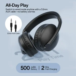 S6001 wireless headphones with a 500mAh battery, can play about 20 hours. Switch to wired mode anytime with a 3.5mm AUX cable, no battery worries.