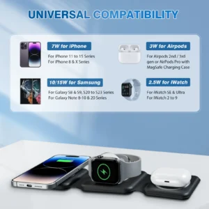 【3-in-1 Wireless Charging】The 3-in-1 wireless charging station can charge your phone, Apple Watch and Airpods. Compatible with Apple AirPods 2/AirPods Pro and Apple Watch Series