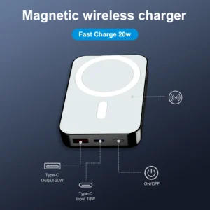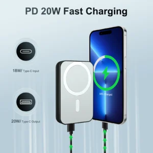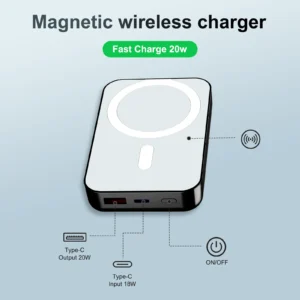 Supports 20W fast charging/supports 15W Qi wireless charging/supports magnetic Qi wireless charging/supports Type C input and output/supports USB output/with magnetic ring suitable for wireless smartphones.