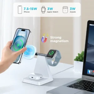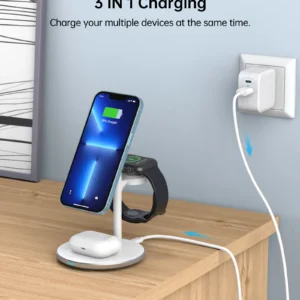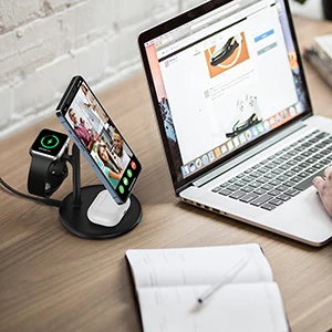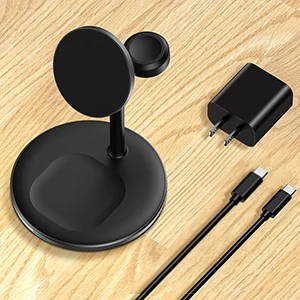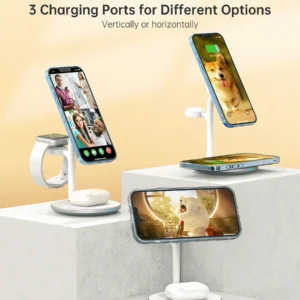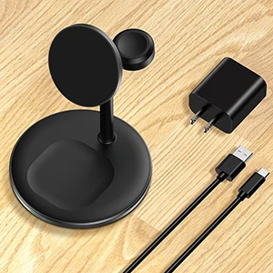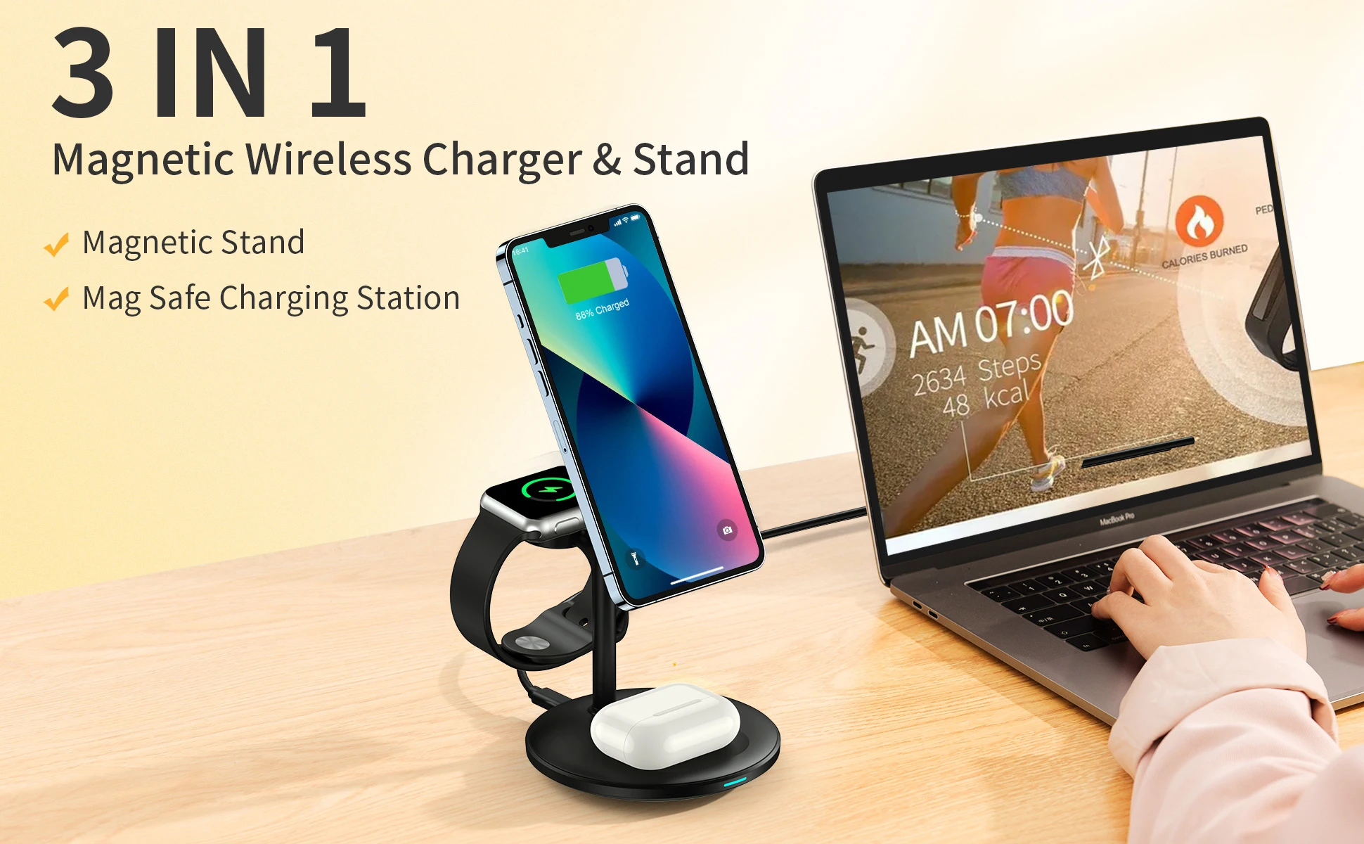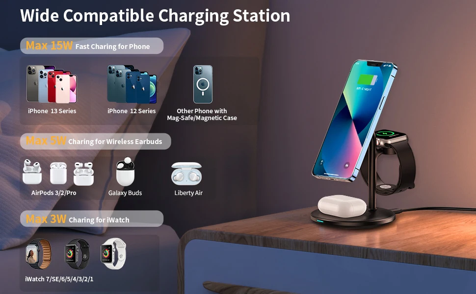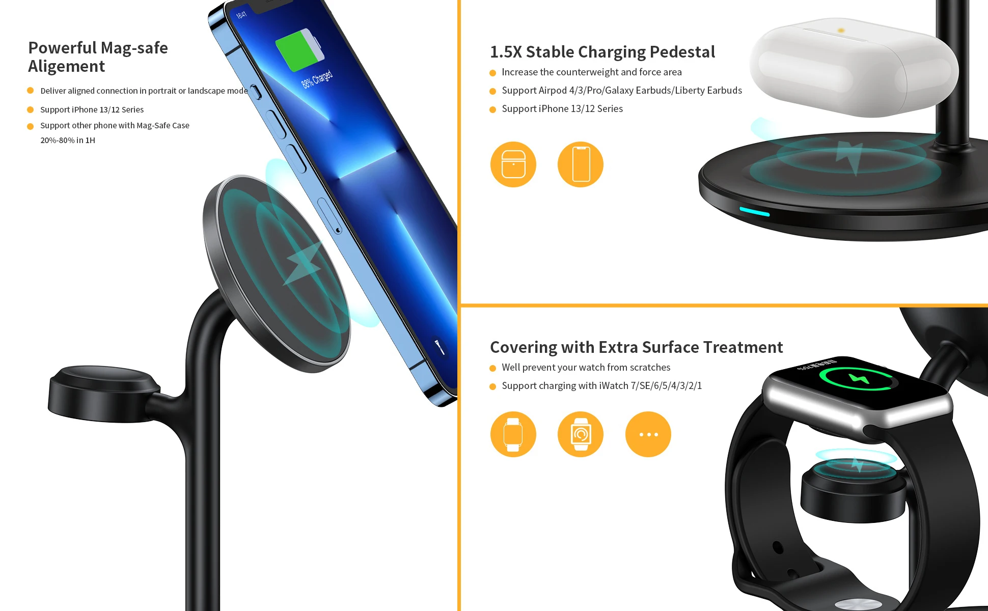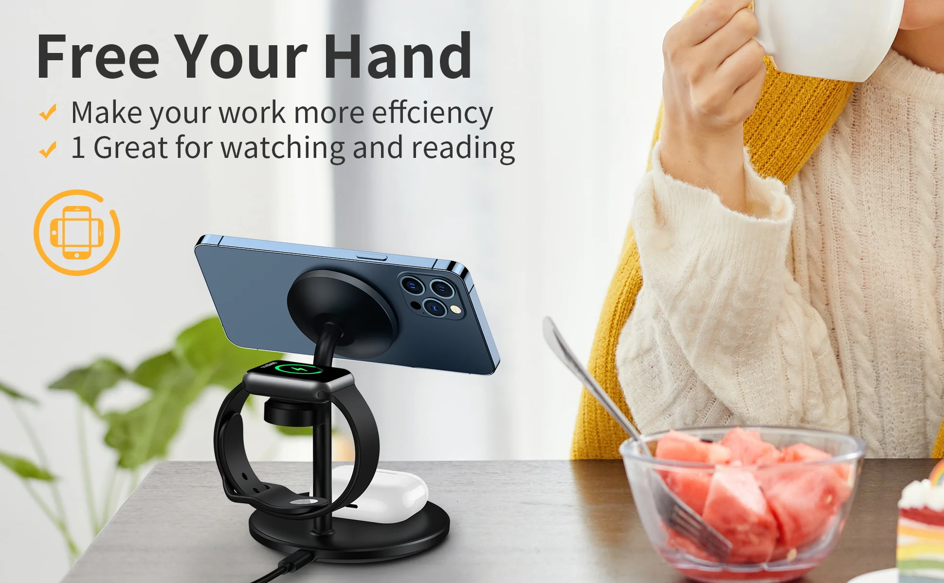 The wireless charger stand acts like a mini stand, holding and charging your iPhone , Apple Watch and AirPods in one place, helping you end the messy cord life and tidy your desktop. 3 charging docks for different charging options as you need.