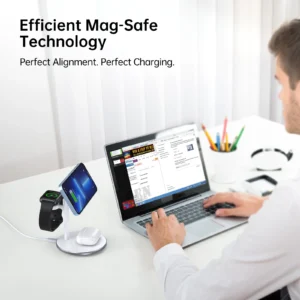 This magnetic wireless charger can charge your iPhone 15/14/13/12 from 0% to 100% in 3-3.5 hours (Based on our lab tests). Nearly as fast as the original Apple Mag-Safe charger. With an upgraded safety system and CE, FCC and Qi-certificates, this wireless charger station provides double guarantees to ensure fast and safe charging!